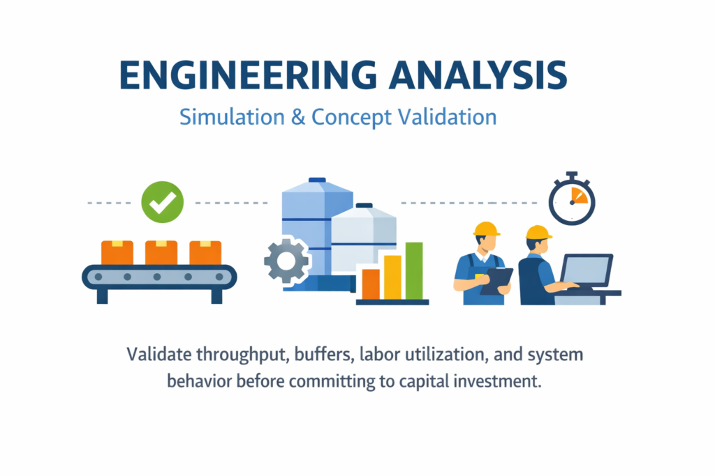 We model and validate automation concepts, facility layouts, and material flow before capital is committed. Our simulation-driven approach reduces risk and improves ROI.